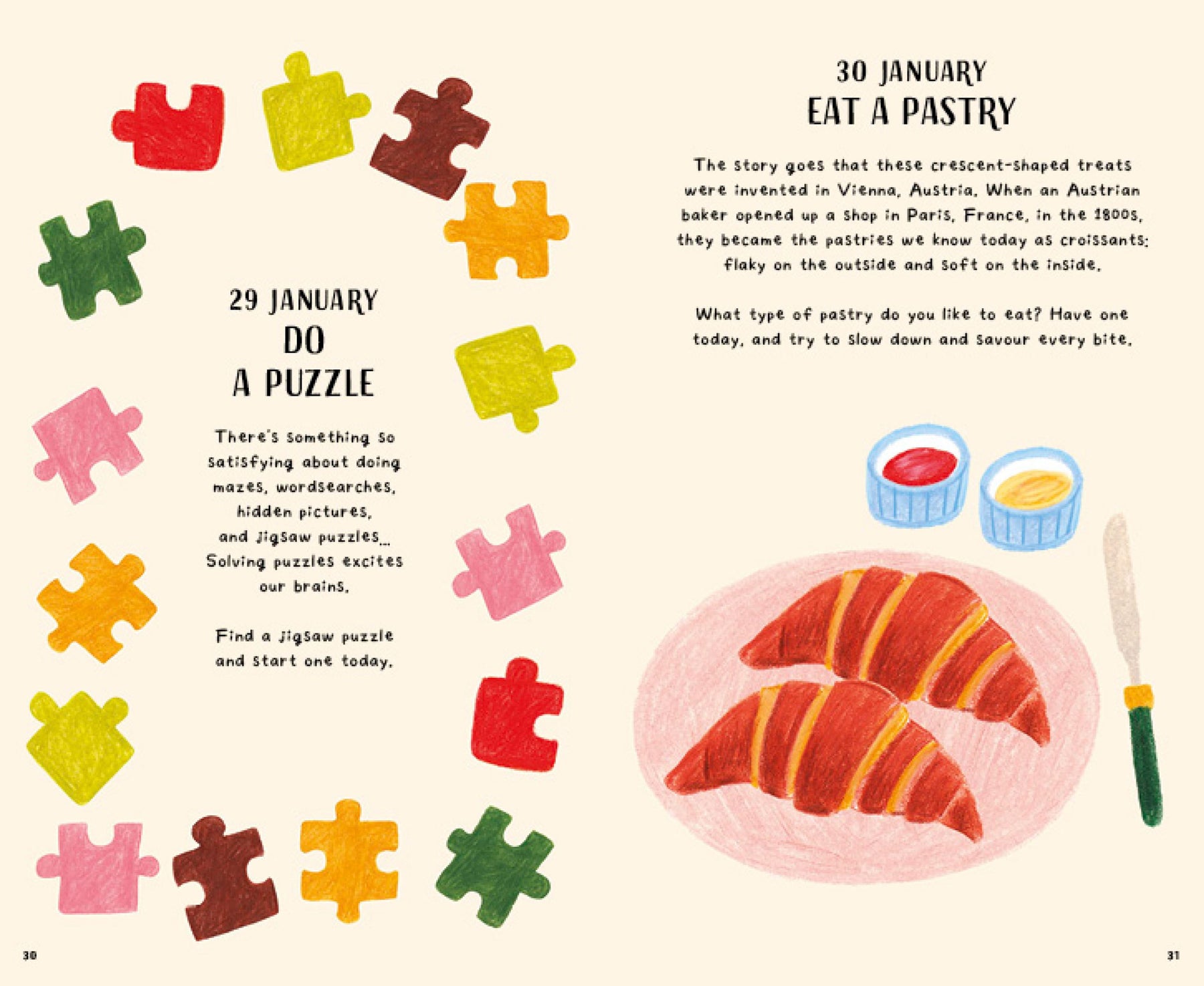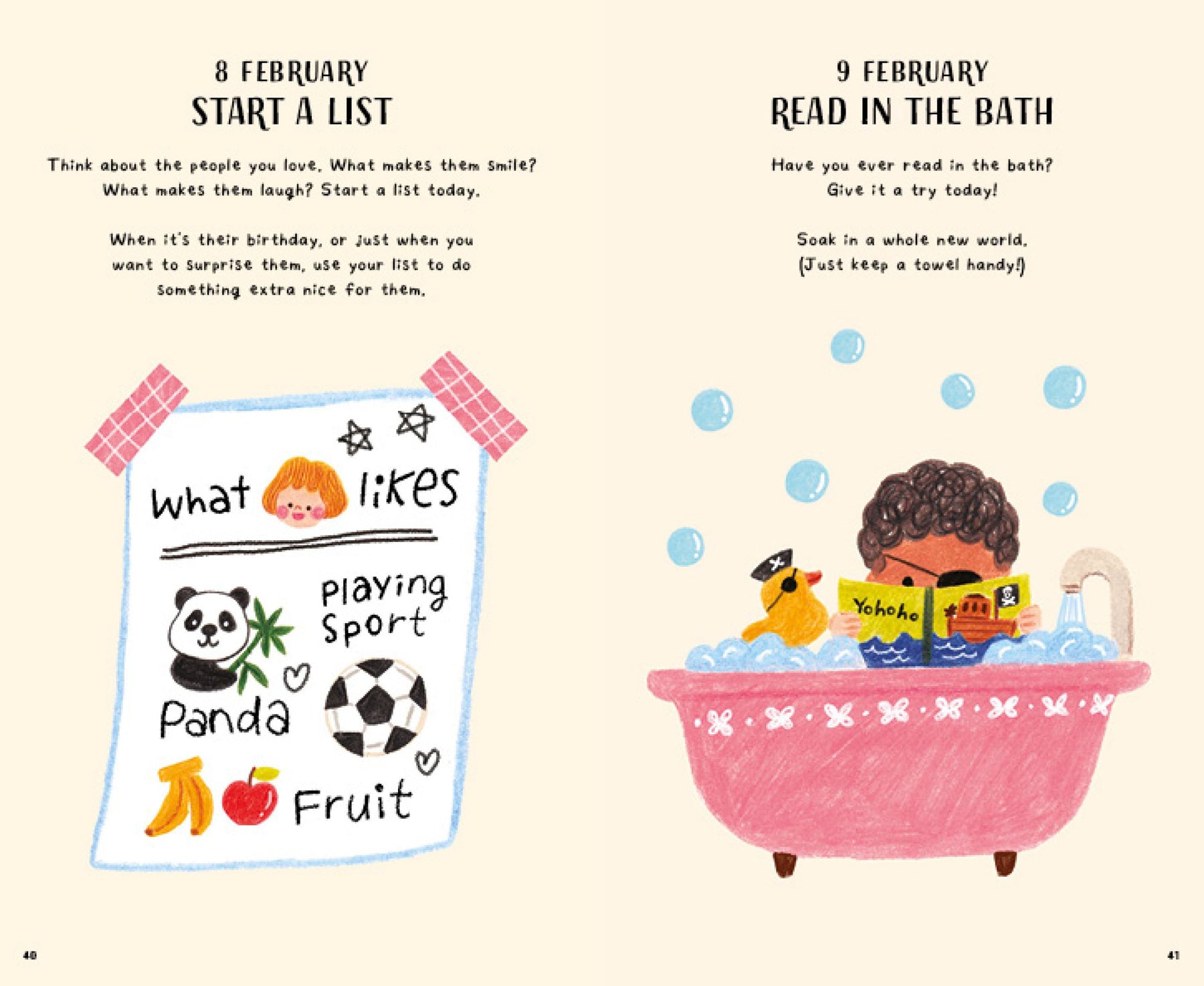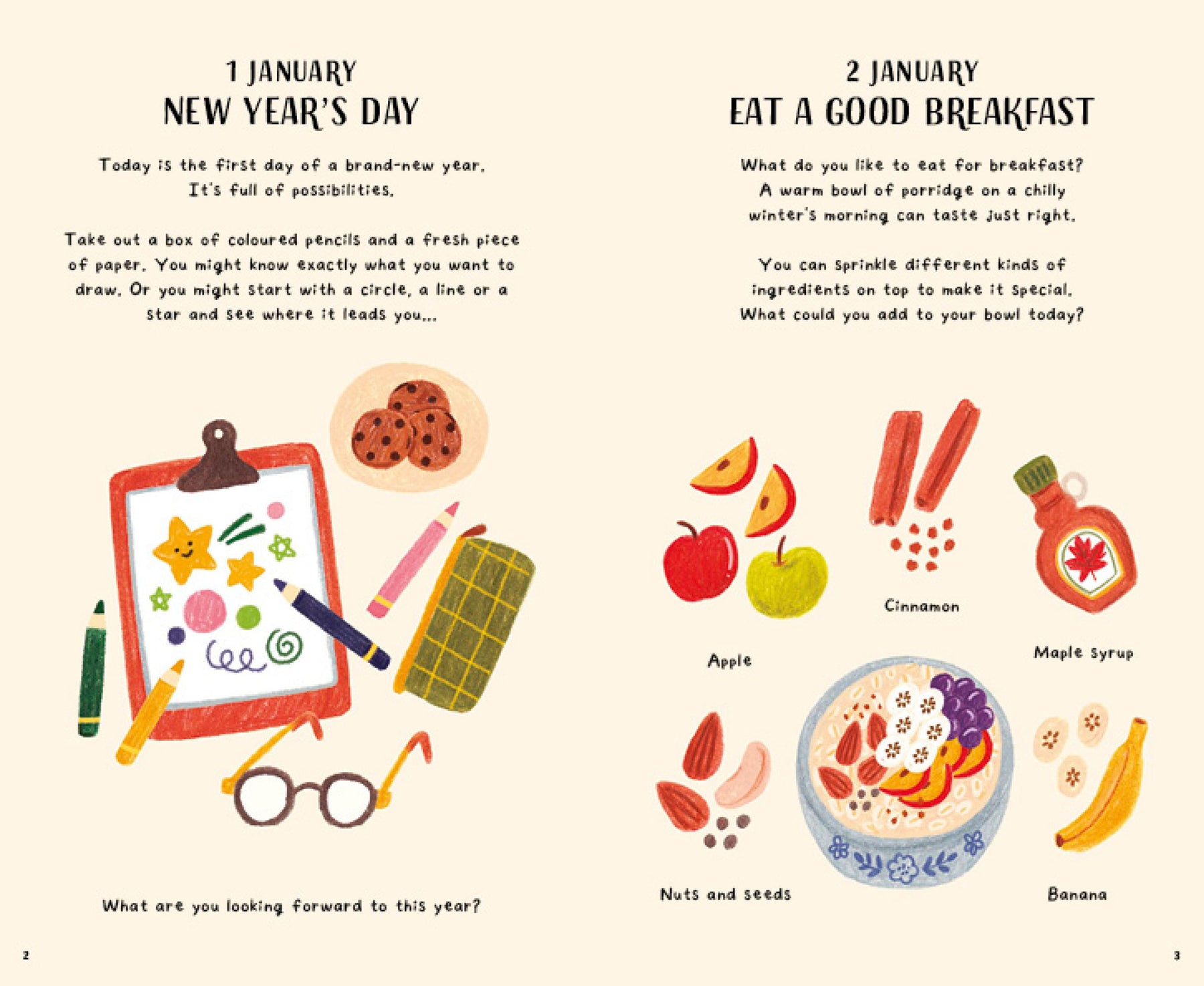 Discover a different way to find happiness every day of the year with this pocket-size book that celebrates little things that bring great joy. Be inspired by famous people on their birthdays; learn how to spot and find flowers throughout each season; create your own gratitude jar; learn how to make pastries; make a gift for someone you love; discover the pleasure of letter writing; and find joy in a rainy day. Packed with art activities, famous birthdays, inventions, international holidays, facts, and trivia about the world around us.