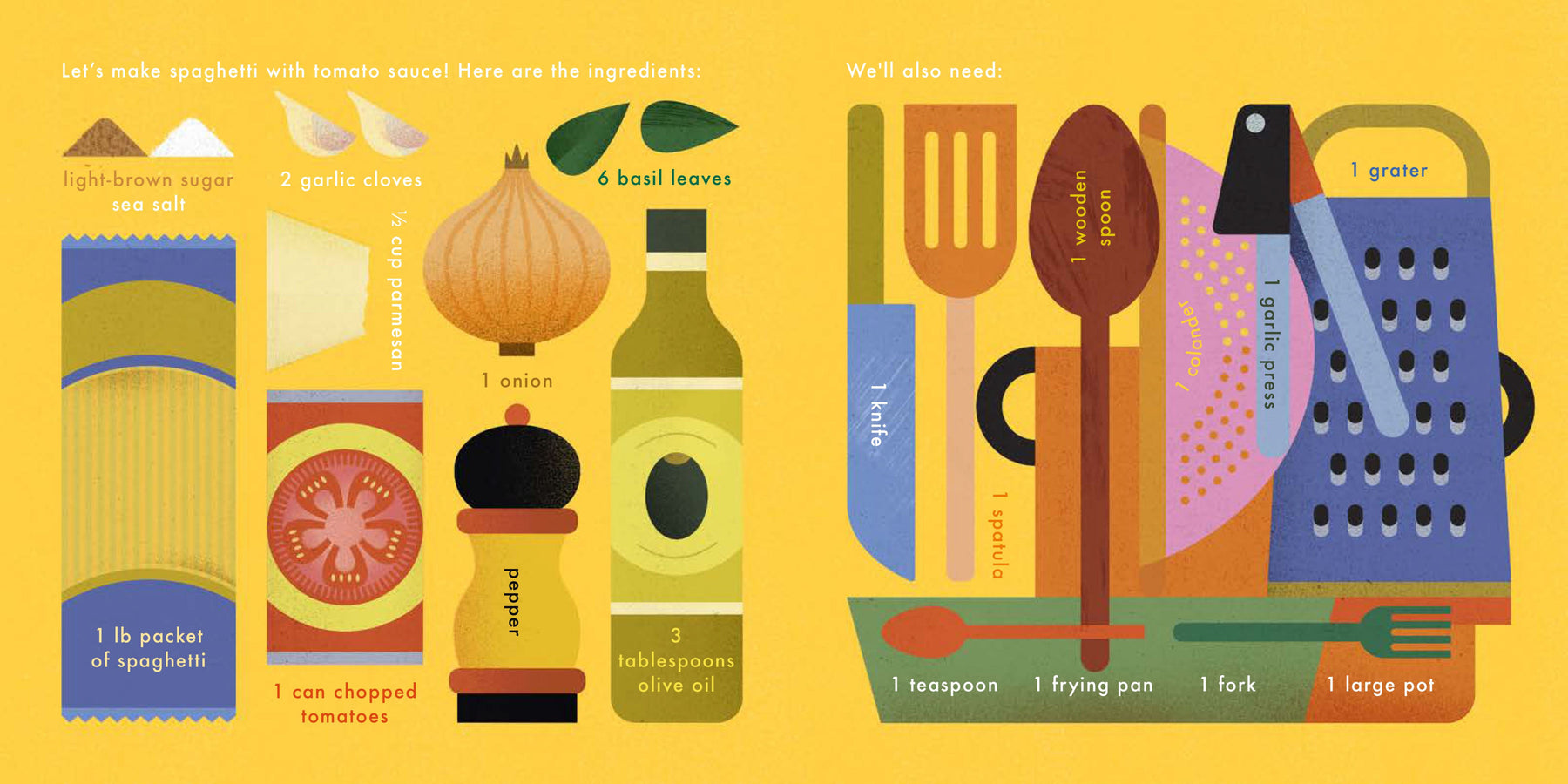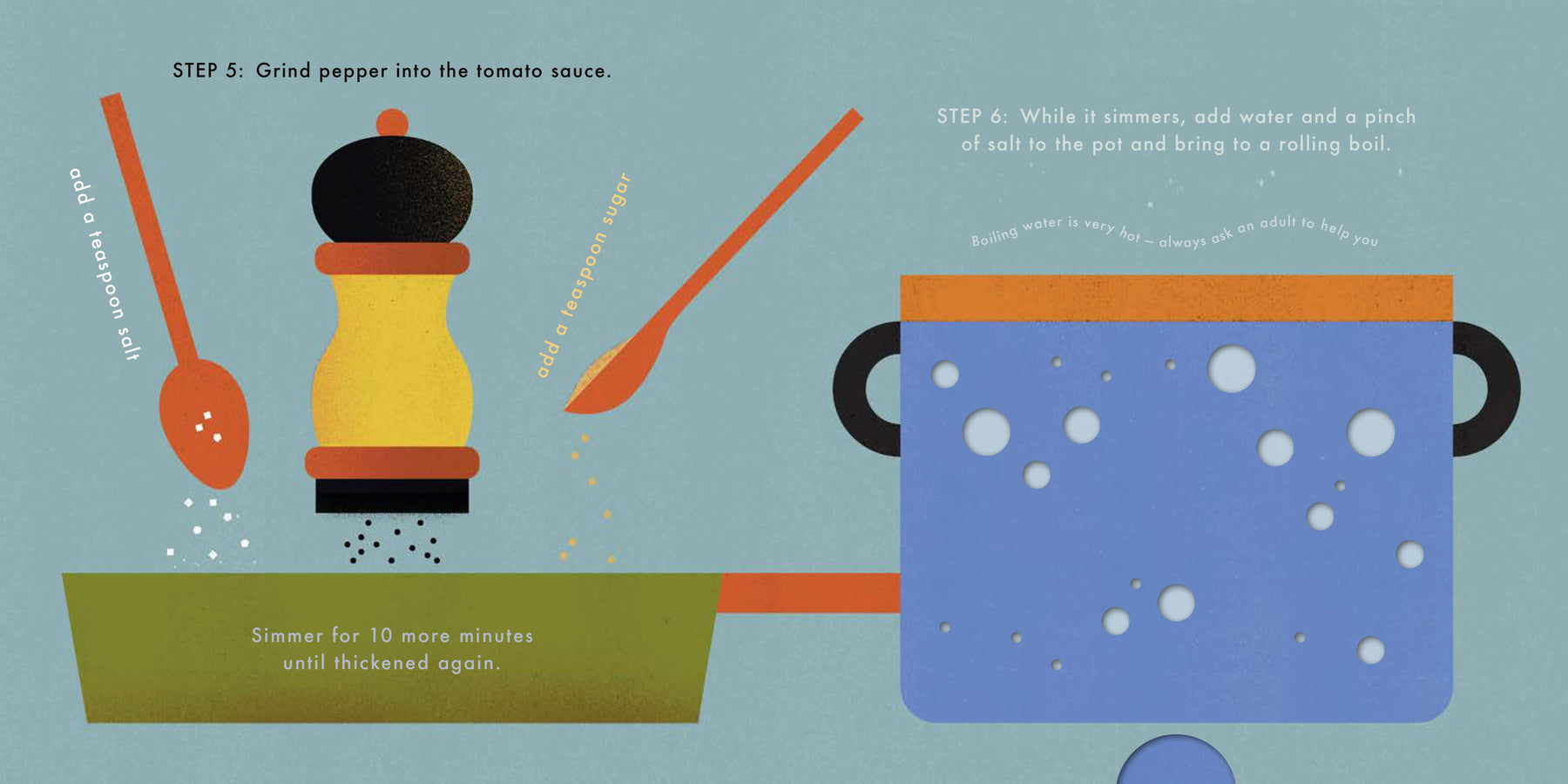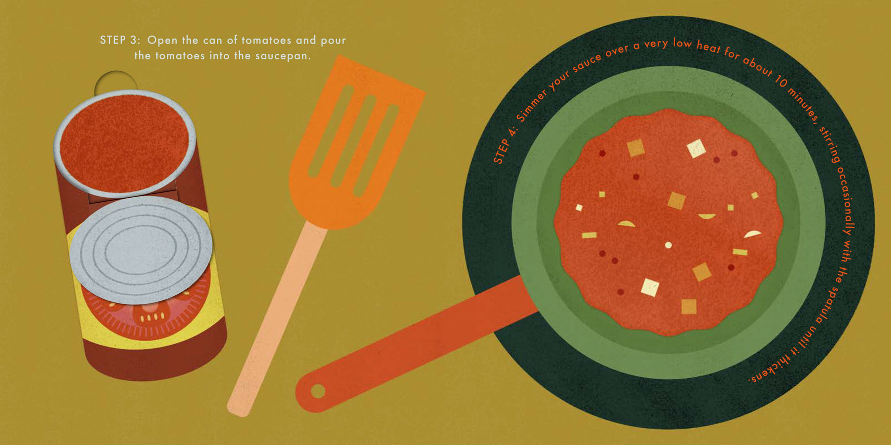 Cook pasta from scratch inside this interactive recipe book – without the chance of spilling anything. Move the tab up and down to add the onions and garlic, lift the flap to open the can of tomatoes, pull the tab to bring the water to a boil, use the punch-out fork to twist some spaghetti onto your fork to taste, and more. One hundred percent adult-free, danger-free, and mess-free – whether you are cooking outside or inside this book, spaghetti has never been so independent!