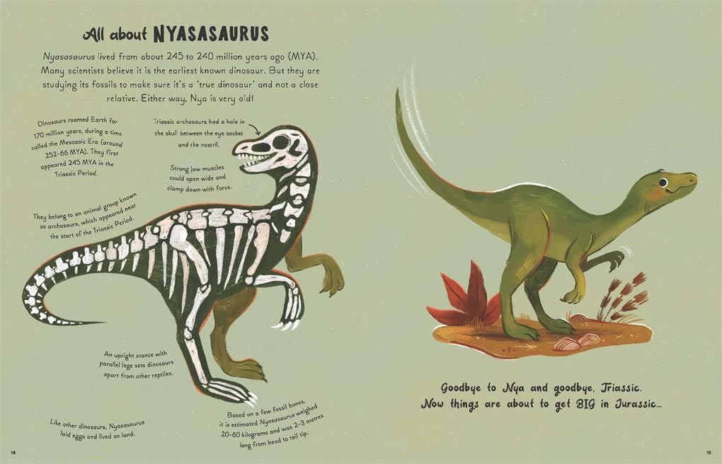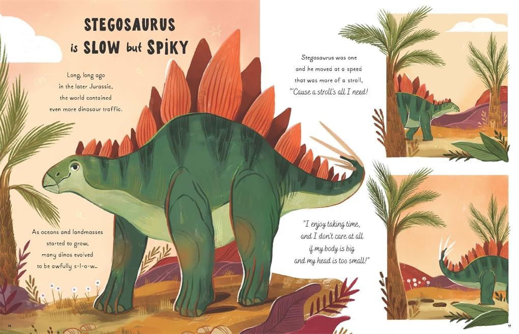 A read-aloud collection of nine non-fiction rhyming stories, each of which tells the tale of a different dinosaur. Meet the feathered Anchiornis, the giant Brachiosaurus, swamp-dwelling Spinosaurus, three-horned Triceratops, and Tyrannosaurus Rex, among others. At the end of each story, explore an informative 'all about' page and learn further information about dinosaurs, from why some species had spikes, to who produced the biggest poo! Written by science writer and poet Gabby Dawnay.