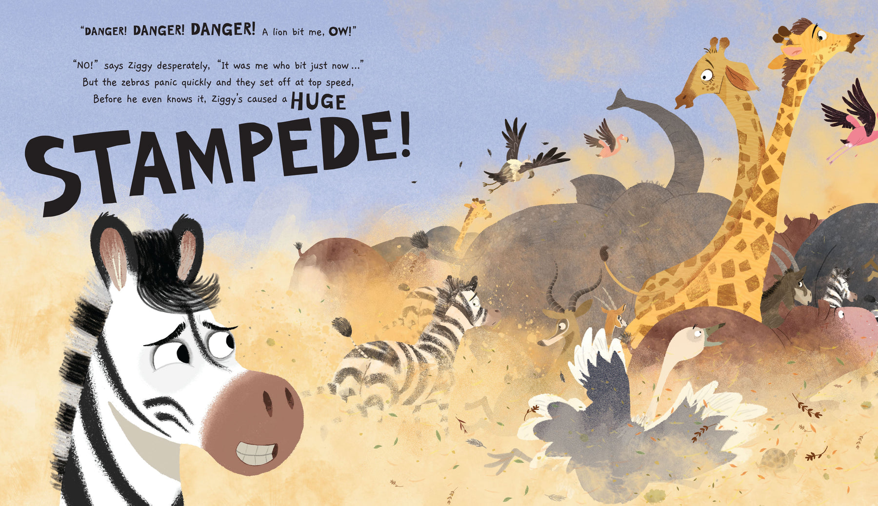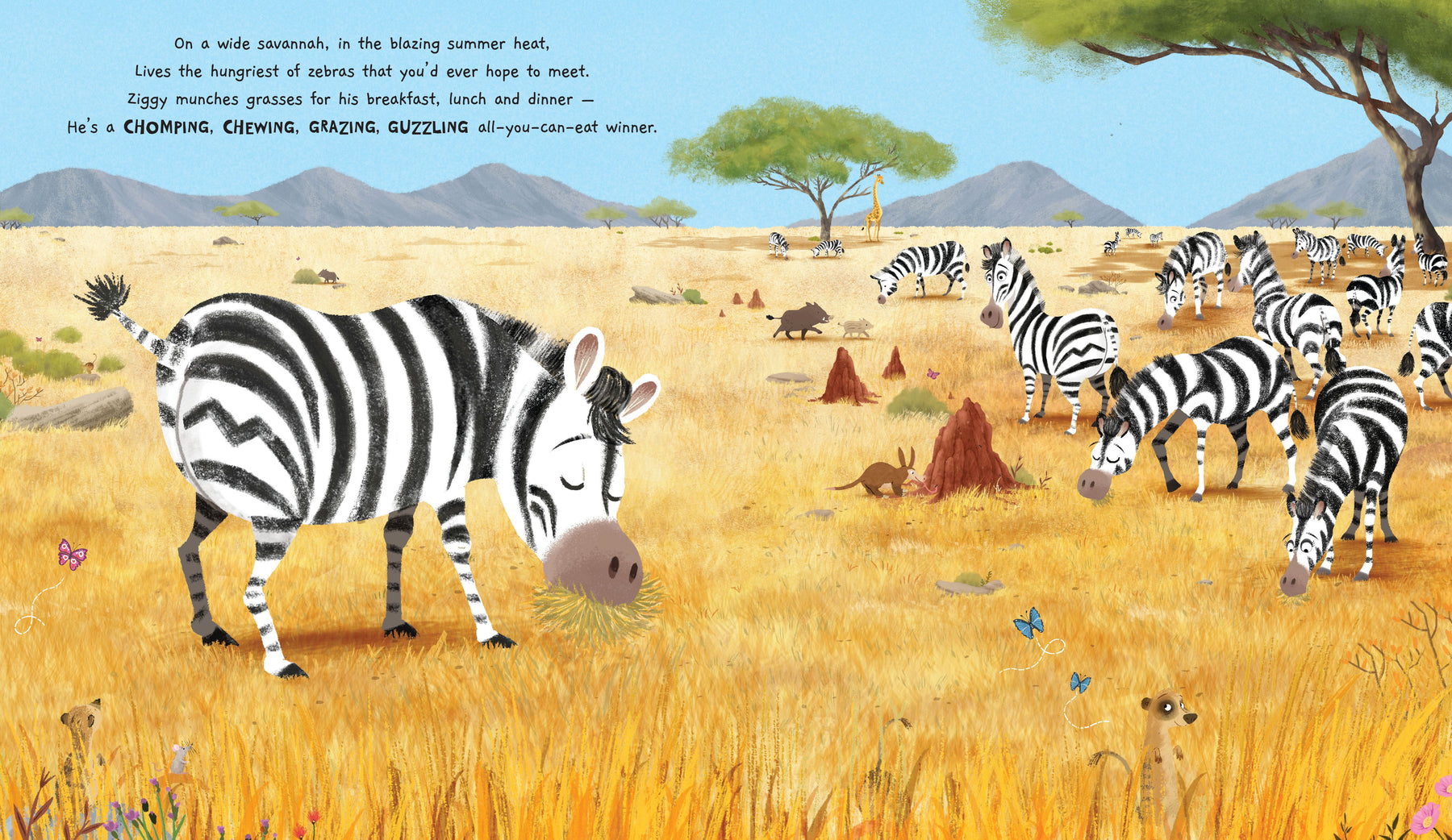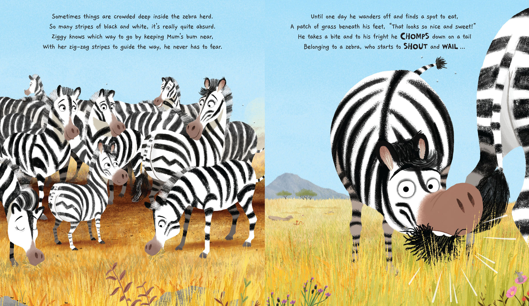 When a young zebra accidentally causes a huge stampede, he finds himself lost and alone. But he knows he'll find home again if he just looks out for his mum's distinctive, zig-zag striped bum. Along the way, he'll encounter big ones, small ones, spotty ones, tall ones, hairy bums, smelly bums, scaly ones and old ones, belonging to huge hippos, very tall giraffes, lazy lions and many more animals besides.