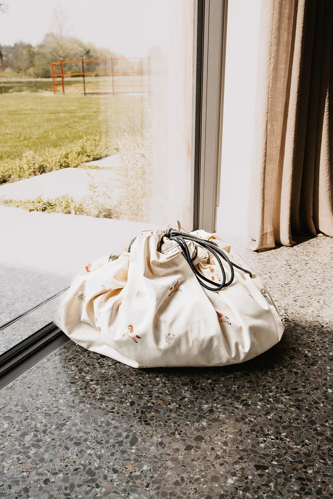 This storage bag and play mat with an enchanting fairytale design takes children on a journey to a world of princes, princesses, castles, and dragons. When unfolded, it becomes a spacious play mat where imagination comes to life. Is the adventure over? Just pull the cord and magically transform the mat into a handy storage bag. Wonderfully magical, super practical, and perfect for little daydreamers!