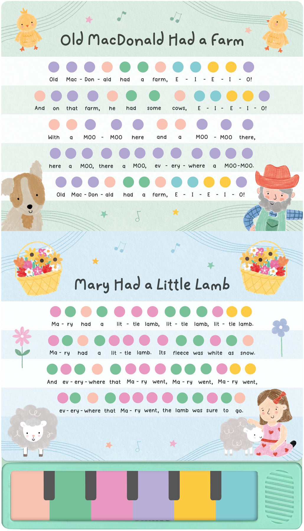 Features an easy-to-use piano module so children can play Old MacDonald, Mary Had a Little Lamb, Ring-a-Ring o'Roses, Hickory Dickory Dock, Incy Wincy Spider, Little Bo Peep, Rock-a-Bye Baby and Twinkle, Twinkle, Little Star