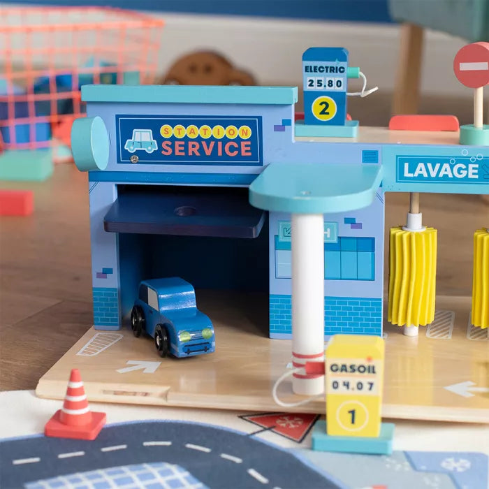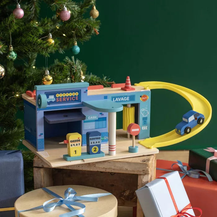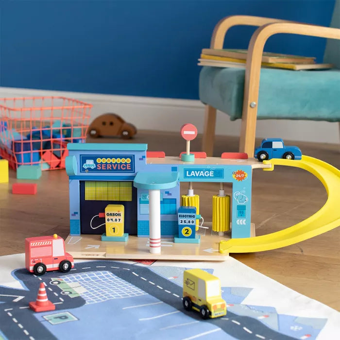 Fill up, wash cars, repair breakdowns, little ones will invent incredible stories with the wooden gas station. This retro-style station includes 1 car, 1 ramp, 2 pumps, 1 box...for hours of play!