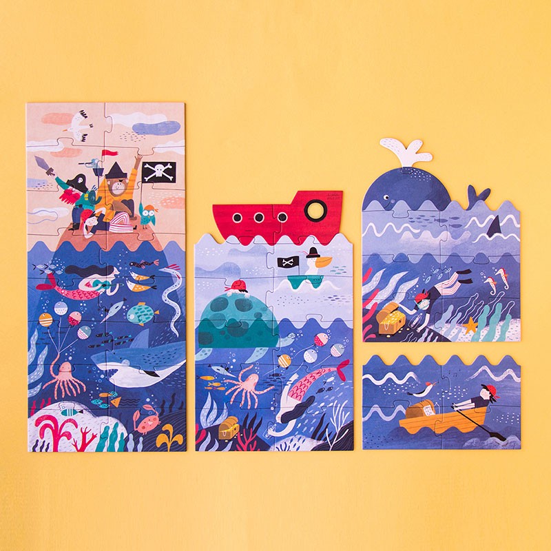 A set of pirate and treasure puzzles of 4, 8, 12 and 16 pieces that are built in layers, from the largest to the smallest.